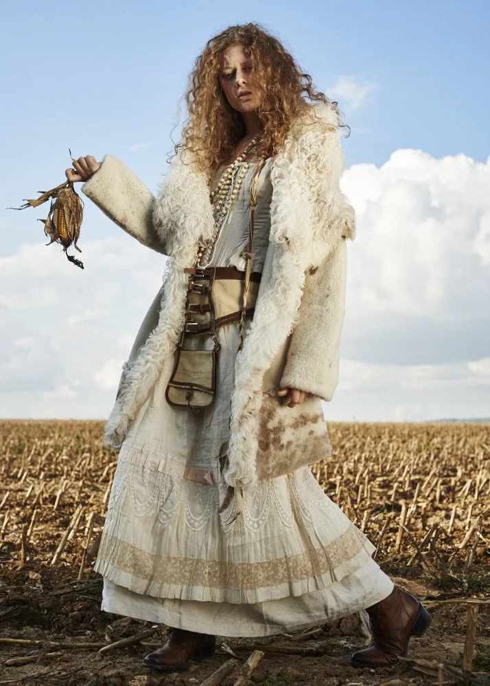A sheepskin waistcoat with tailored shirting, a floor-length hand-painted skirt with worn leather boots.
