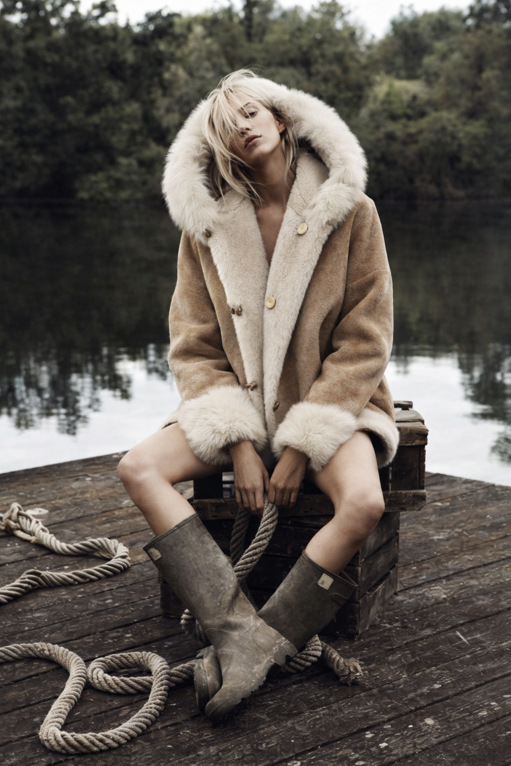 Cut to a shorter length, the shape is relaxed yet clean through the body, allowing it to sit easily over knitwear while maintaining definition. The generous hood is trimmed with plush shearling, framing the face and adding texture to the otherwise minimal exterior.
