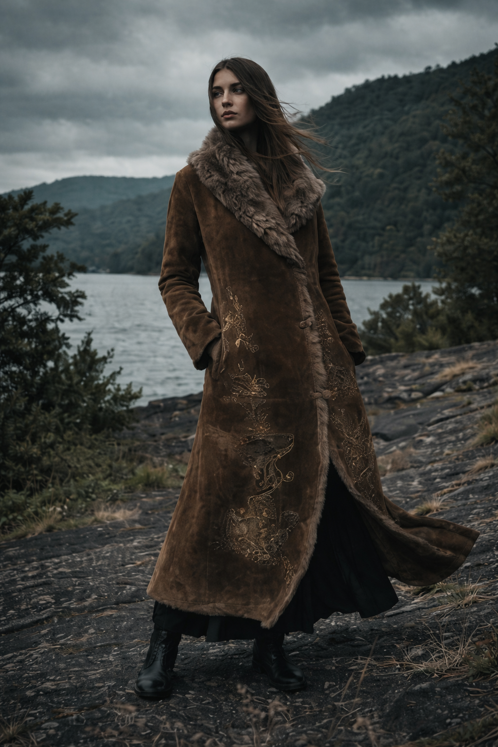 Cut to a long, elegant line, the coat falls cleanly through the body with gentle shaping for definition. The dramatic Toscana shearling collar wraps across the neckline and front edge, forming a deep, asymmetric closure that enhances both warmth and visual impact. The natural pile of the Toscana adds movement and softness against the distressed suede exterior.