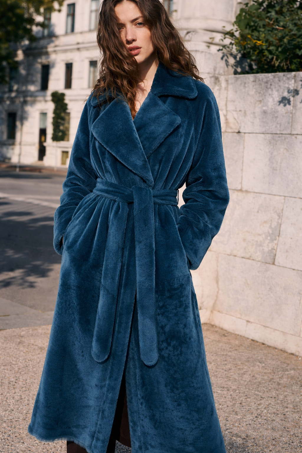 The rich petroleum tone adds depth and character to the piece, giving the coat a modern, understated presence while highlighting the natural texture of the Merinillos shearling.