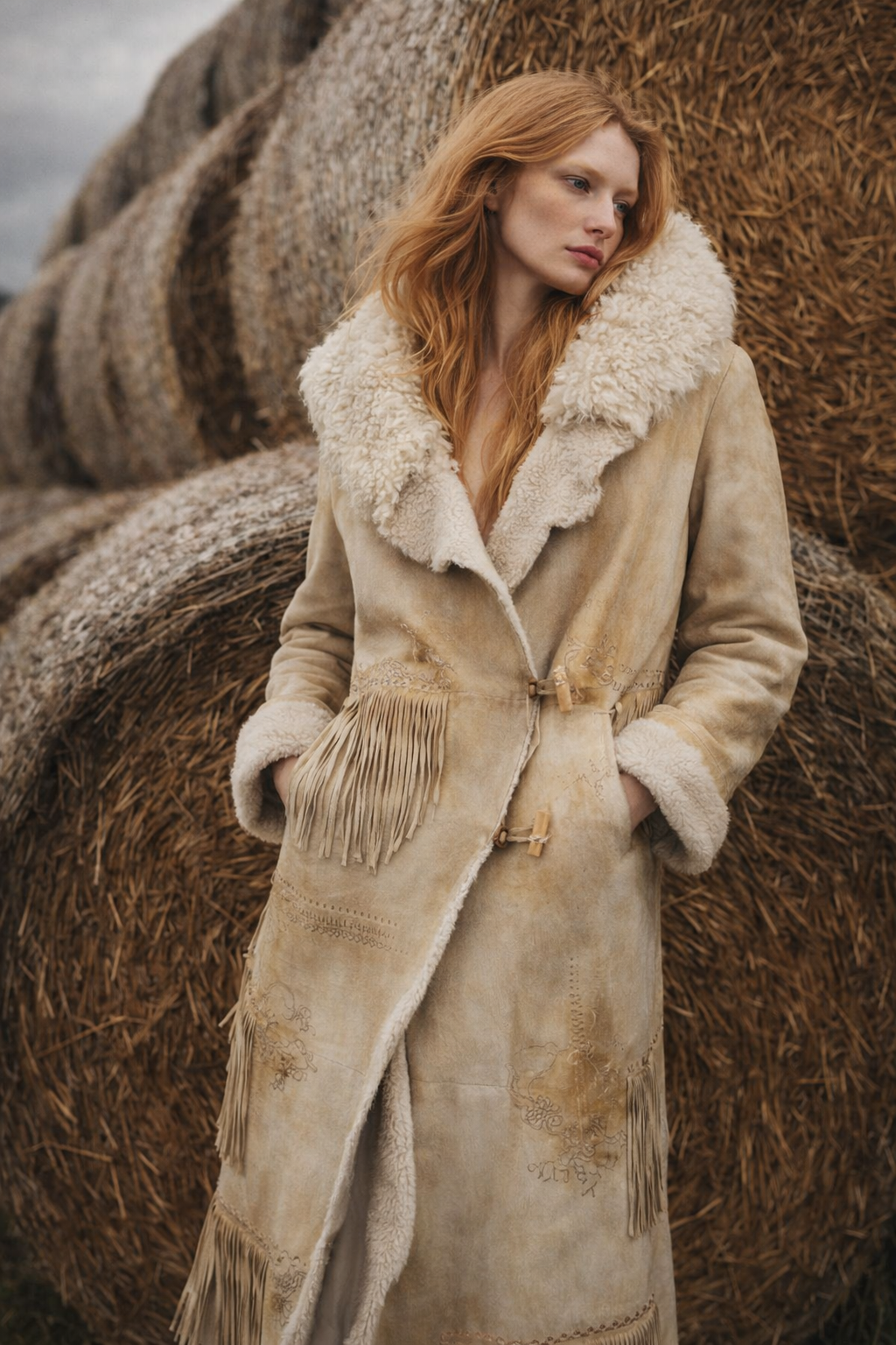 Cut to a long, gently shaped silhouette, the coat falls cleanly through the body while maintaining warmth and movement. A generous shearling collar frames the neckline and folds naturally into an asymmetric front closure, revealing the soft interior. The surface has a lightly distressed, tonal finish that enhances the depth of the Cream Rustico shade.