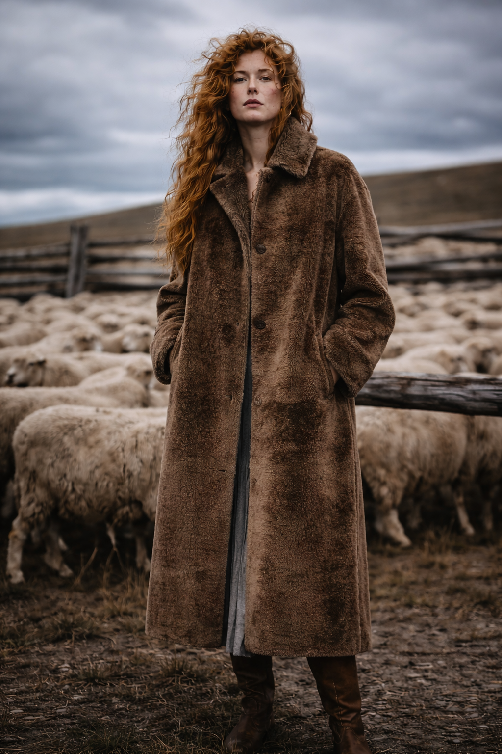 A timeless full-length shearling coat crafted from premium Merinillos and finished in a rich Brown Waxy tone. The design combines understated structure with natural texture, creating a refined outerwear piece that feels both classic and effortless.