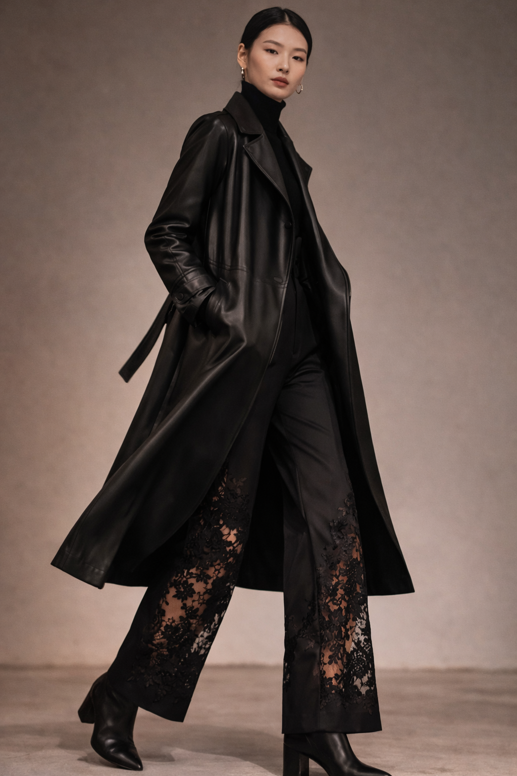 A full-length trench cut from smooth black leather with a soft, fluid drape. The silhouette is relaxed but defined, shaped through the waist with a self-tie belt for adjustable structure.