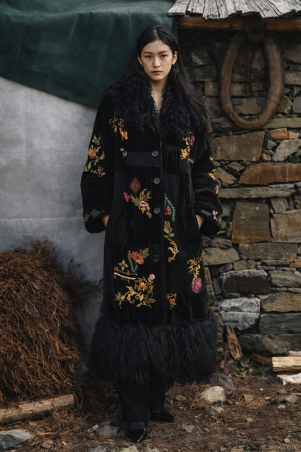 Panels of suede and velvet are combined in a subtle patchwork layout, creating depth through tonal contrast. Floral embroidery is scattered across the body and sleeves, introducing colour and artisanal character against the dark base. A plush shearling-style collar frames the neckline, while a matching deep trim at the hem adds dramatic finish and movement.